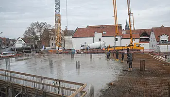 Das OP- und Funktionsgebäude ist ein zentraler Baustein der baulichen Zielplanung 2030, mit der sich die Fachklinik St. Josef-Stift Sendenhorst baulich für die Zukunft aufstellt. Der erste Meilenstein wurde bereits am 18. November 2025 erreicht, als die Grundplatte gegossen wurde: Circa 150 Fahrzeuge lieferten damals etwa 1.300 Kubikmeter Beton, der mit zwei großen Pumpen in die Verschalung befördert wurde. Auf diesem ein Meter hohen Fundament wachsen nun die vier Geschossebenen in die Höhe.