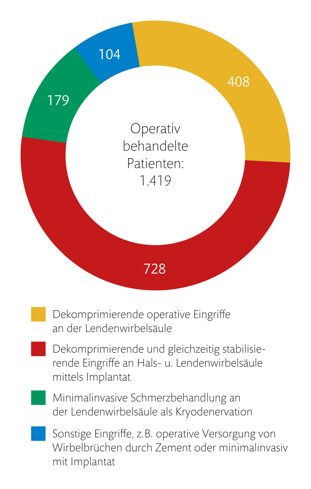 Mehr als 1.600 Patienten behandelt die Klinik für Wirbelsäulenchirurgie jährlich stationär, mehr als 1.400 von ihnen werden operativ versorgt. Den Schwerpunkt bilden dabei dekomprimierende und stabilisierende Eingriffe an Hals- und Lendenwirbelsäule, häufig auch mit entsprechenden Implantatversorgungen.