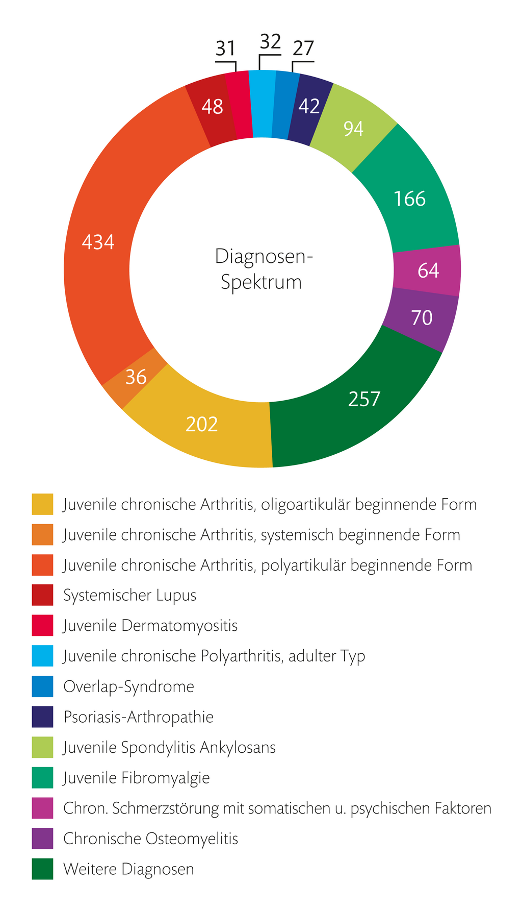 Die Ärzte der Klinik für Kinder- und Jugendrheumatologie behandeln mehr als 1.500 Patienten jährlich stationär und sehen mehr als 2.400 Patienten ambulant. Zu den häufigsten Diagnosen zählen die juvenile chronische Arthritis und die juvenile Fibromyalgie.